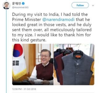 His khadi jacket became global trend. All over the world started wearing khadi jacket. In U.S.A people and many officers wear khadi jacket and called it modi jacket. The president of South Korea Moon jae-in inspired to Narendra modi ji and often he sees in khadi jacket.