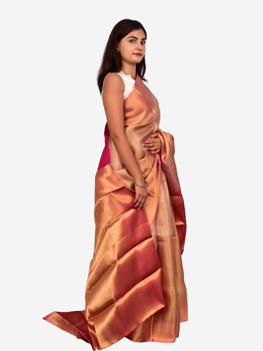 | Design | Shimmer Finish, Contrast Pink Pallu |