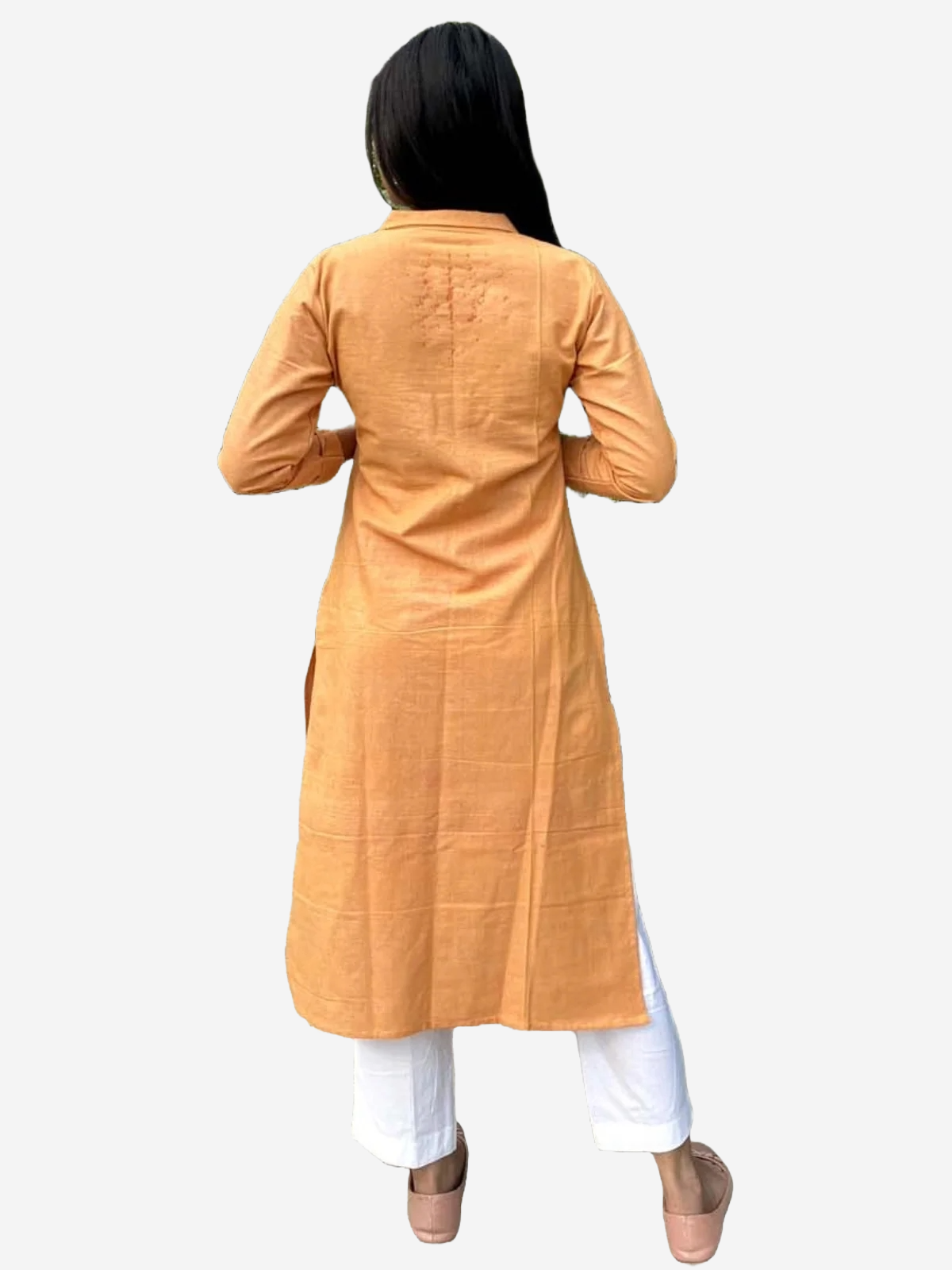 Refresh your wardrobe with this elegant Khadi cotton kurta in a warm peach shade—a versatile addition perfect for both everyday wear and special occasions.