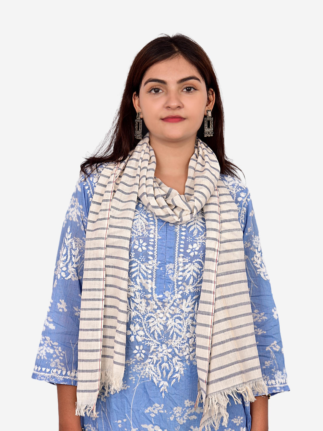 Navy Striped Stole: Classic off-white base adorned with fine navy blue stripes and delicate fringed edges.